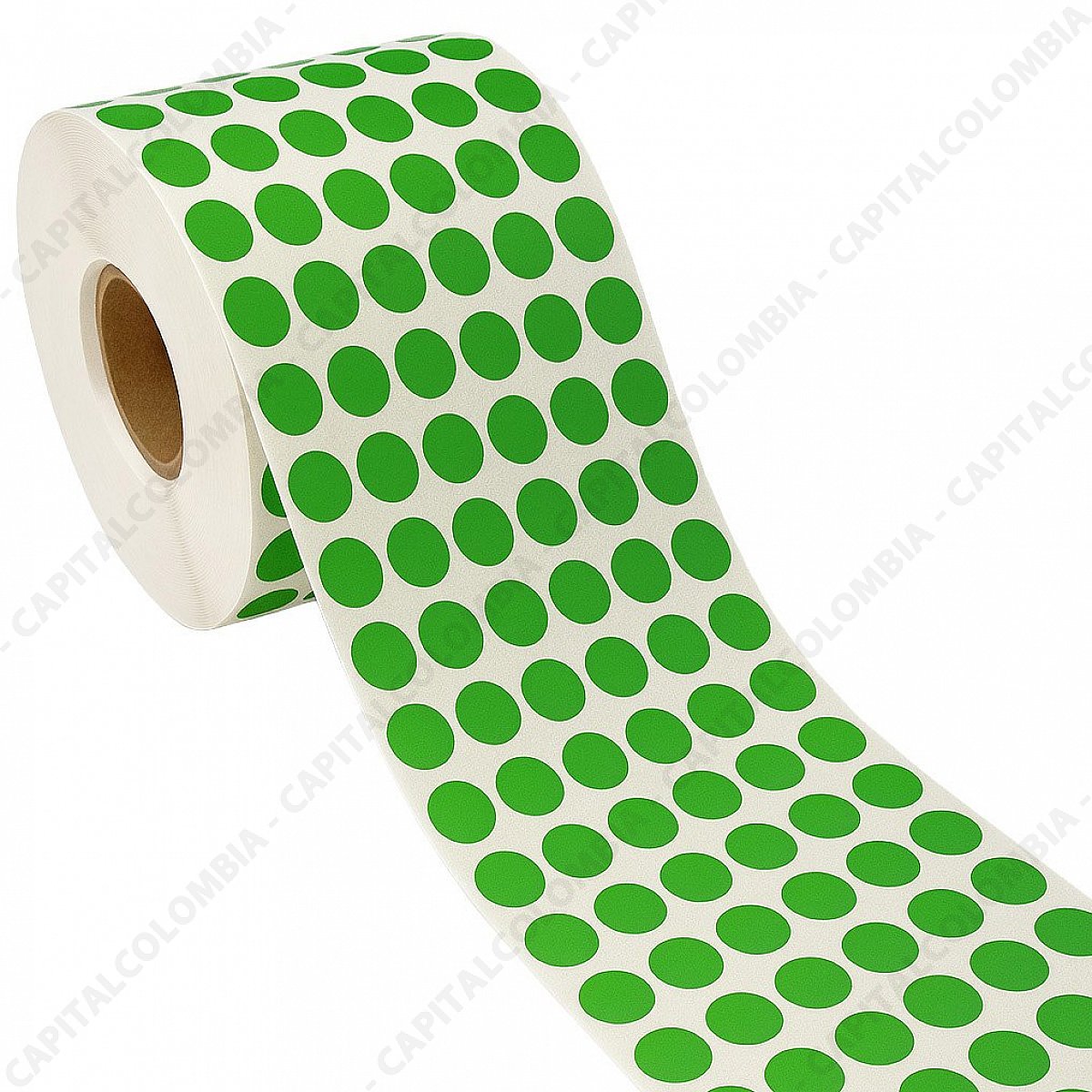 Rollo de etiquetas circulares color verde en papel de transferencia de 20.000 rótulos a seis columnas de 1.3cms x 1.3cms (13x13mm)