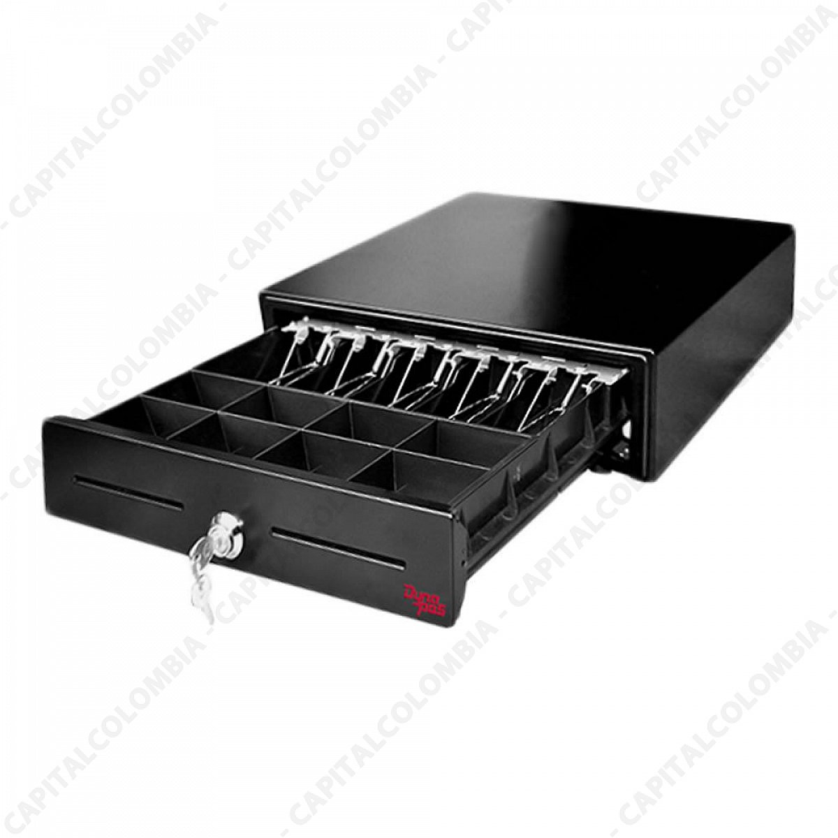 Cajón monedero Dynapos (RJ11)Cajón monedero DYNAPOS para puntos de venta POS, metálico, conexión dedicada, color negro, 6PIN/24V, clips metálicos, 2 ranuras frontales, compartimientos ajustables: 5/billetes, 8/monedas, Dimensiones: 42cms (ancho) x 44cms (largo) x 10cms (alto).